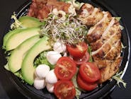 mix sałat/filet z grilla/ chipsy bekonowe/ pomidorki koktajlowe/ avocado/ świeża mozzarella/ kiełki rzodkiewki/ orzechy nerkowca// dressing ziołowo- bazyliowy -